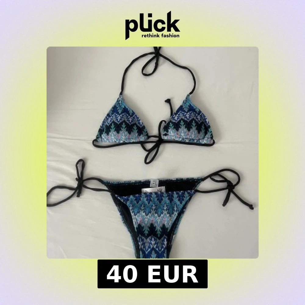 Snygg bikini med triangelformad topp och knytband i både topp och botten. Mönstret är i blå, svart och vit med inslag av turkos och rosa. Helt ny och inte använd! Säljer för att den är tyvärr för liten för mig och jag vill inte betala returkostnader. Storlek XS!
