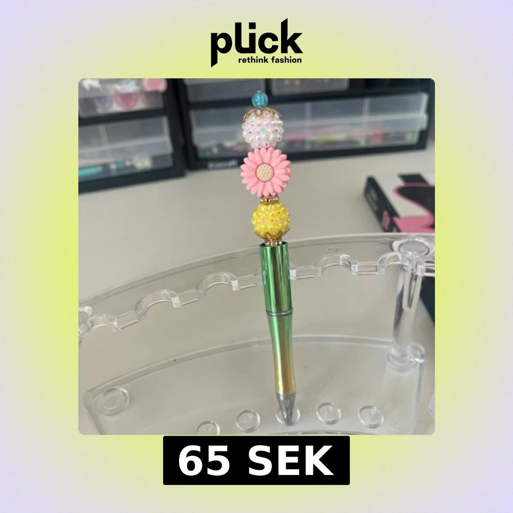 Hemmagjord grön, gul och rosa penna med en blomma i mitten🌸 Och färgglada pärlor💕