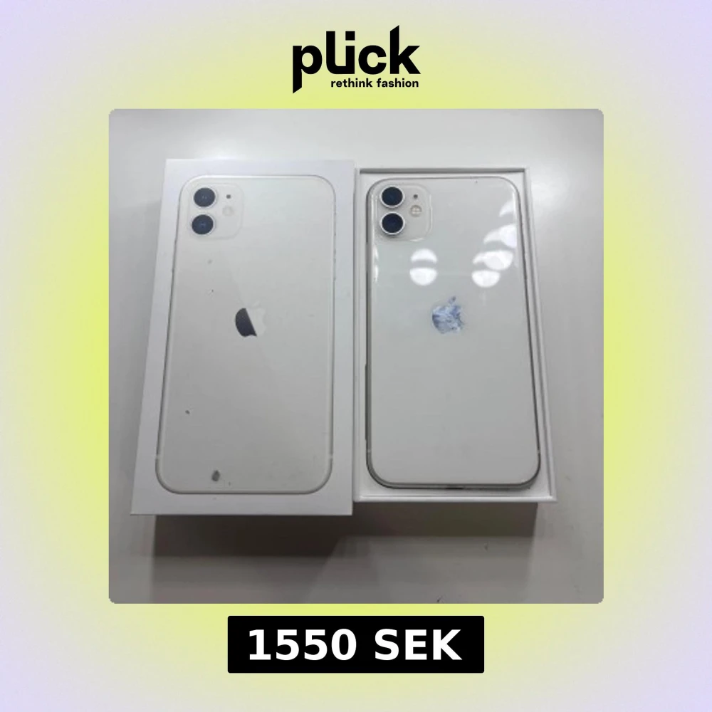 Bilderna visar en vit iPhone 11 med originalkartong och ett svart skal. Telefonen har dubbla kameror på baksidan och ser ut att vara i nytt skick. Perfekt för dig som vill ha en snygg och pålitlig smartphone till ett bra pris. Allting är i nyskick förutom batteri som ligger lite lägre! 128GB och mobilskal tillkommer! Olåst.
