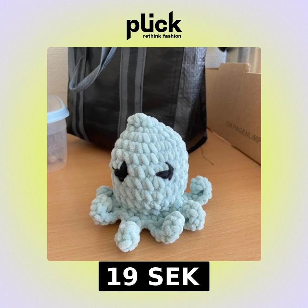 Ingen bok syns på bilden, endast en virkad bläckfisk i ljusblått garn. Ingen information om titel, författare eller bokinnehåll kan utläsas.