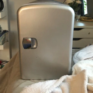 Säljer ett kompakt och stilrent silverfärgat minikylskåp. Perfekt för att hålla drycker kalla. Utrustad med både AC och DC-anslutningar, vilket gör den flexibel för användning hemma eller i bilen. Har en enkel öppningsmekanism och rymmer flera burkar.