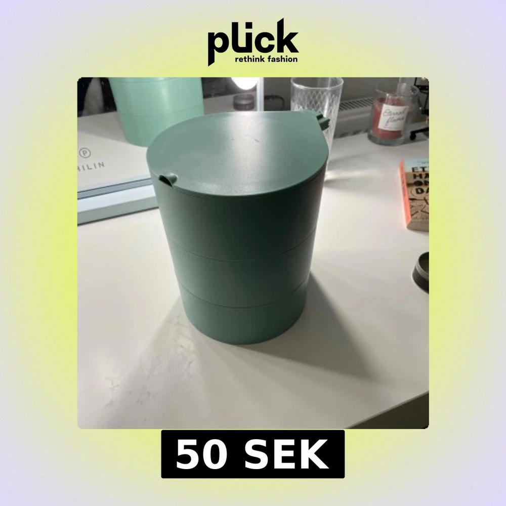 Praktisk grön förvaringsbox i plast med tre våningar och inbyggd spegel. Varje våning har olika fack för smycken, smink eller småprylar. Snygg och modern design, i mycket fint skick utan synligt slitage. Perfekt för organiserad förvaring på sminkbordet.