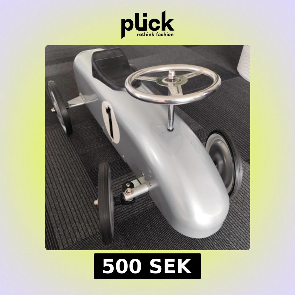 Retro pedalbil i silverfärgad metall med svart sits och ratt i krom. Nummer 1 på sidan, robust konstruktion och klassisk design. Passar barn, perfekt för lek eller som dekor. Mycket fint skick, inga synliga defekter eller slitage.