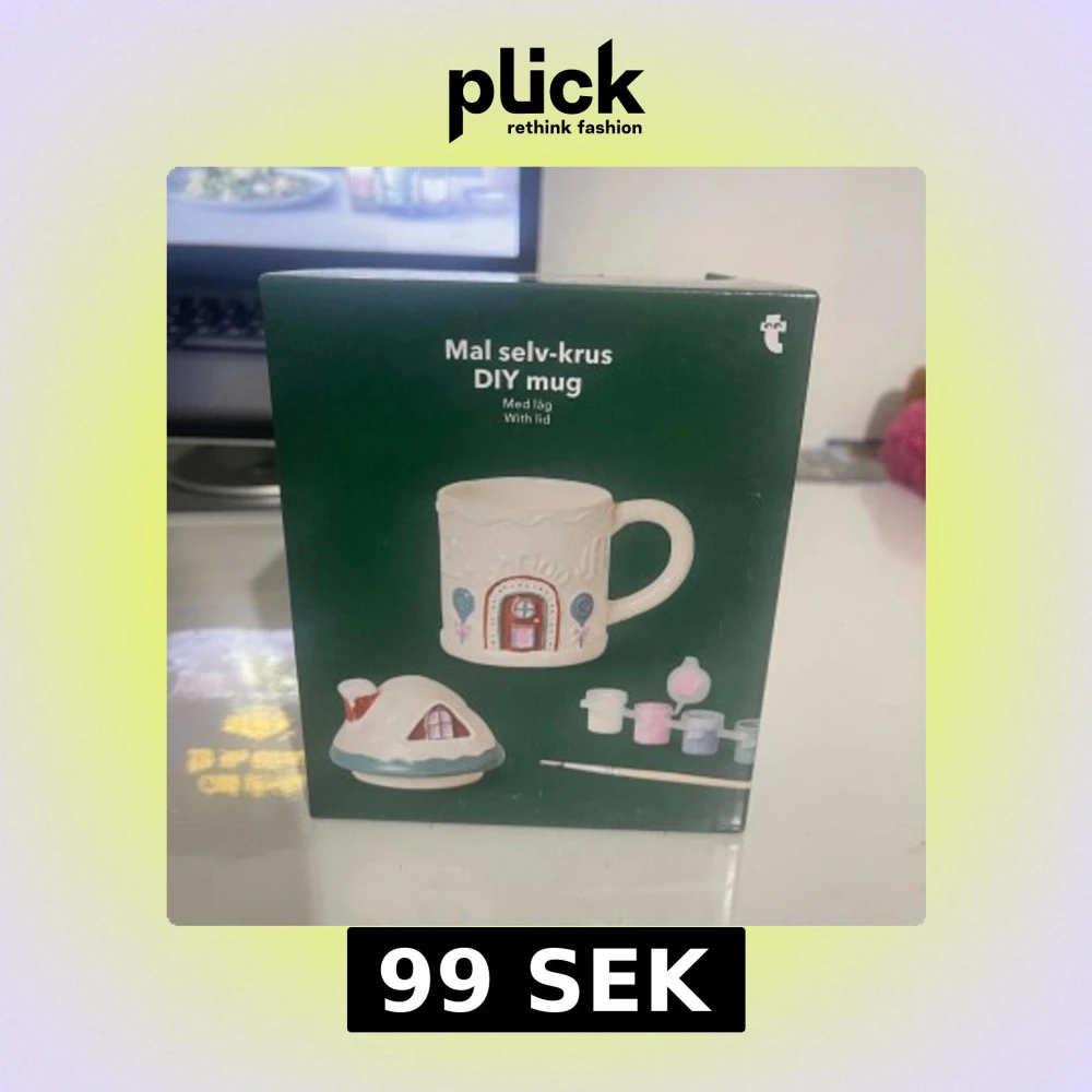Produkten på bilden är ett DIY-krus med lock, där du själv kan måla och dekorera muggen. Setet innehåller en keramikmugg med lock, pensel och färger. Perfekt för kreativa projekt och personlig design. Muggen är ny i förpackning och visar inga tecken på slitage.