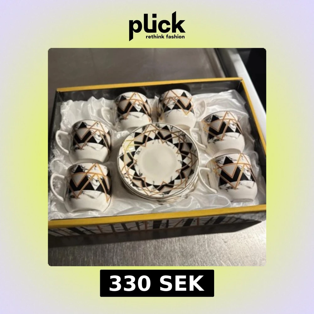 Elegant set med sex espressokoppar och matchande fat. Designen är i svart och vitt med geometriska mönster och guldlinjer. Perfekt för att lyfta kaffestunden med en touch av stil.