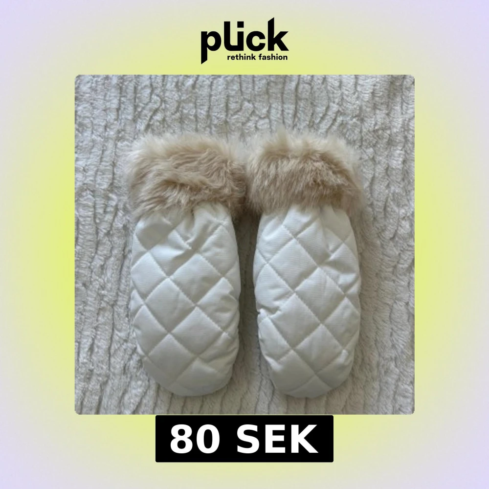 Säljer ett par vita vantar med mjuk beige fuskpäls vid mudden. Vantarna har ett snyggt rutmönster på ovansidan och är perfekta för kalla vinterdagar. De har en klassisk tumdesign och elastisk kant för bra passform.