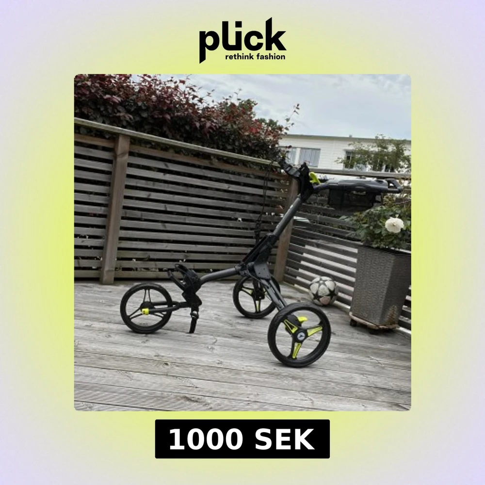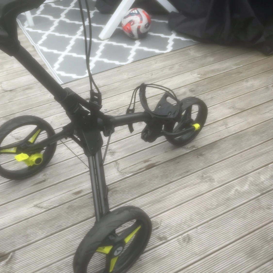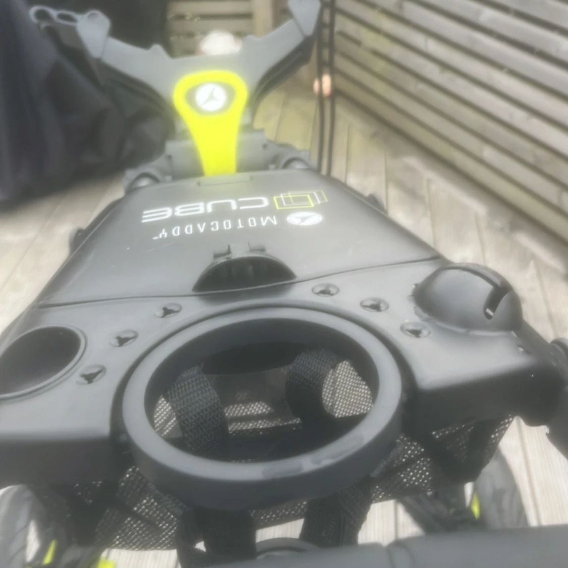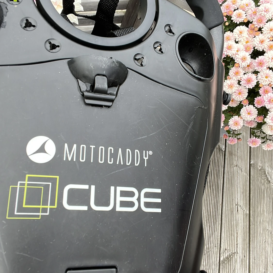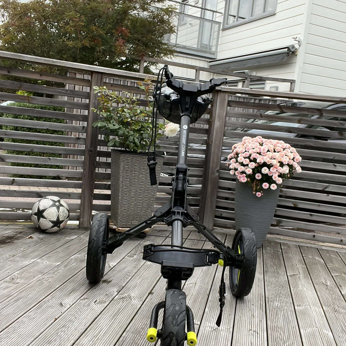 Säljer en svart golfvagn Motocaddy Cube med tre hjul och detaljer i gult. Perfekt för att rulla runt golfbagen på banan. Smidig och lätt att fälla ihop, med praktiska hållare och robust ram i syntetmaterial.