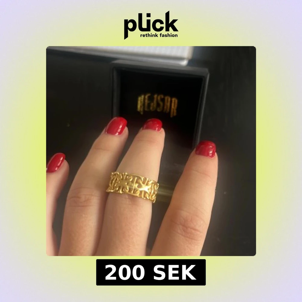 Säljer en snygg guldfärgad ring från Kejsar med ett unikt, öppet mönster som ger coola vibes. Ringen har en bred design och detaljerade utskärningar som gör den till ett statement piece. Perfekt för dig som gillar att sticka ut med dina accessoarer.