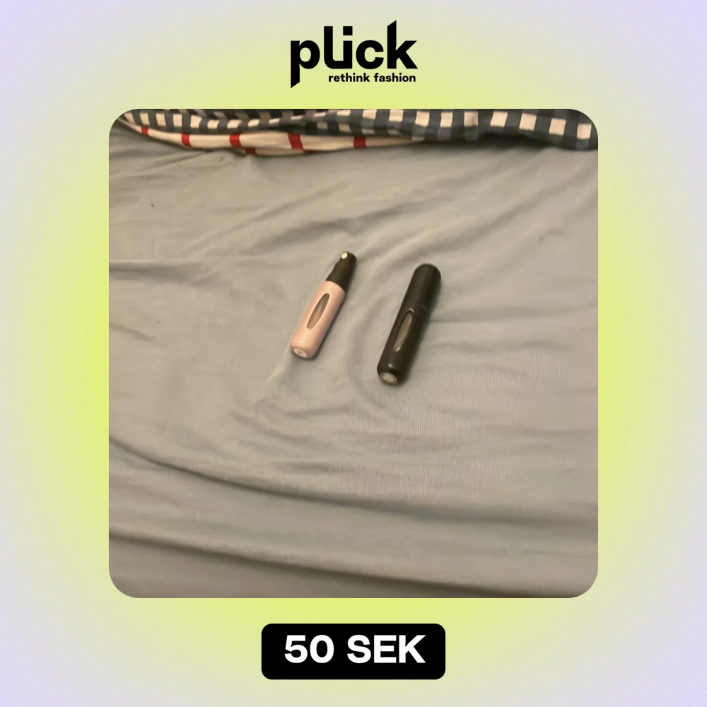 Säljer två praktiska parfymbehållare i svart och rosa. Perfekta för resor eller att ha i väskan. De är små och smidiga med en stilren design. Fyll på med din favoritdoft och ta med överallt! Sampels för bra pris!