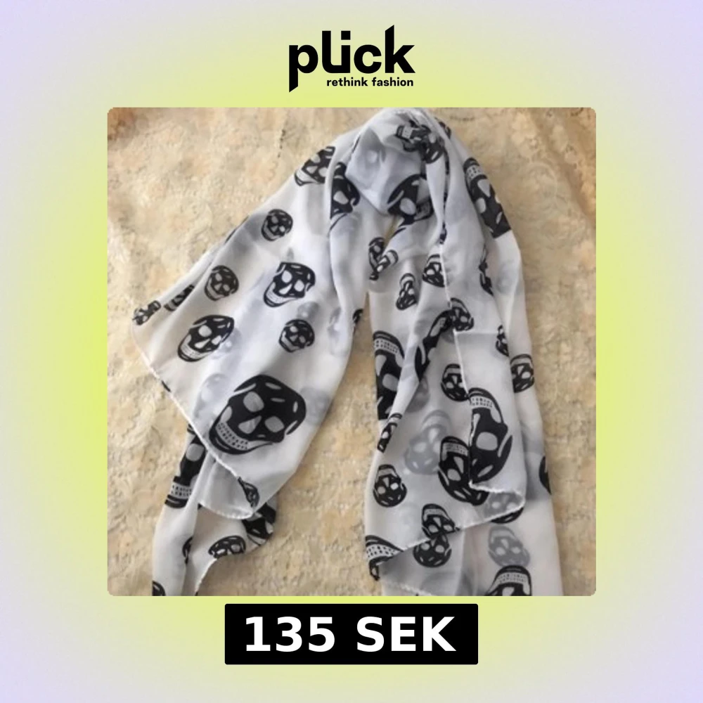 Snygg och tunn halsduk i vitt med svarta döskallemönster. Perfekt accessoar för dig som gillar lite edgy stil. Halsduken är rektangulär och gjord i ett lätt, transparent material som känns skönt mot huden. Alexander McQueen inspirerad. Mått: 167x70cm