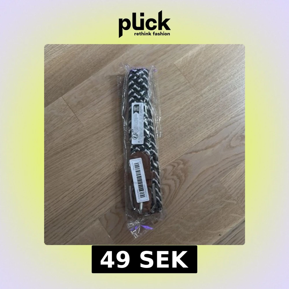Snyggt flätat bälte i svart och vitt med bruna skinn-detaljer och silverspänne. Perfekt accessoar för att lyfta din outfit med en cool och modern touch. Bältet har ett randigt mönster och är flexibelt tack vare den stickade designen.