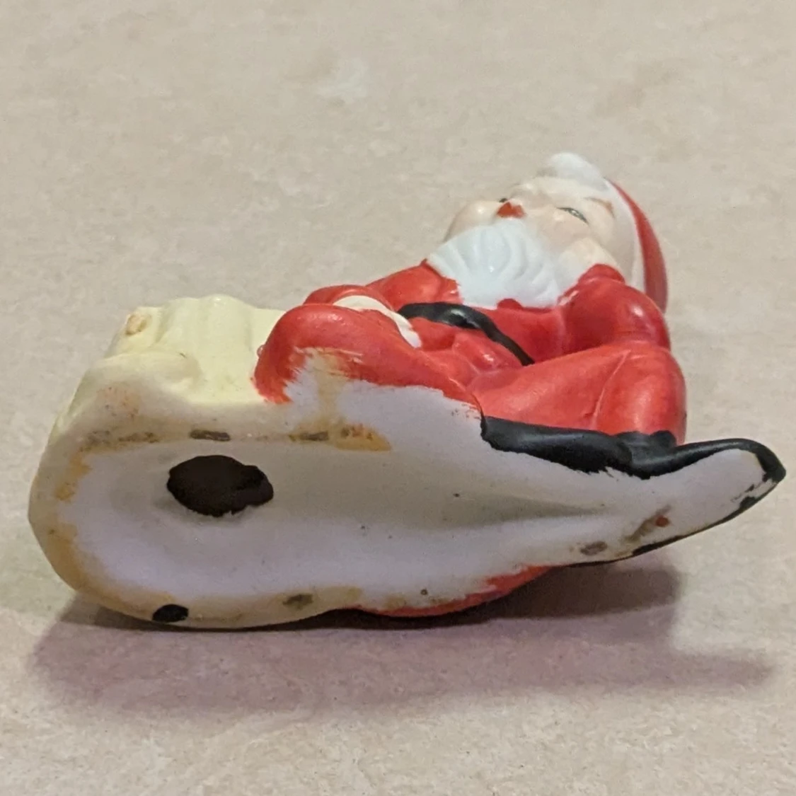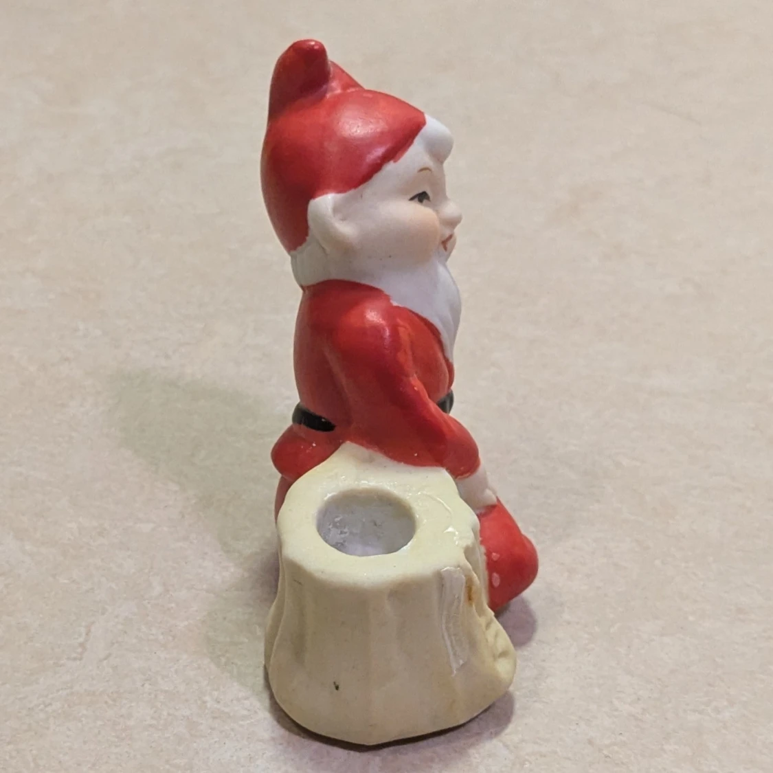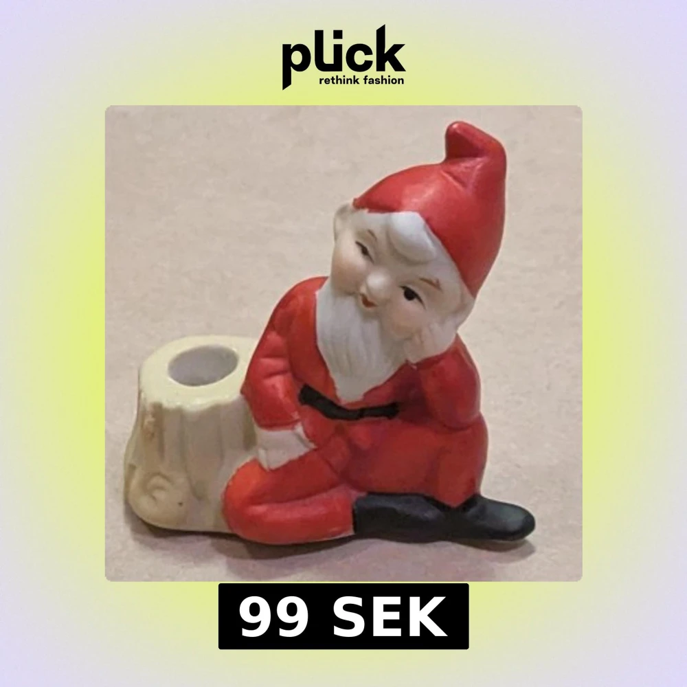 Denna produkt är en dekorativ tomtefigur i keramik, troligen avsedd som ljushållare. Tomten är klädd i röd dräkt och sitter lutad mot en stubbe. Produkten visar inga tydliga tecken på slitage eller skador. Perfekt som juldekoration.