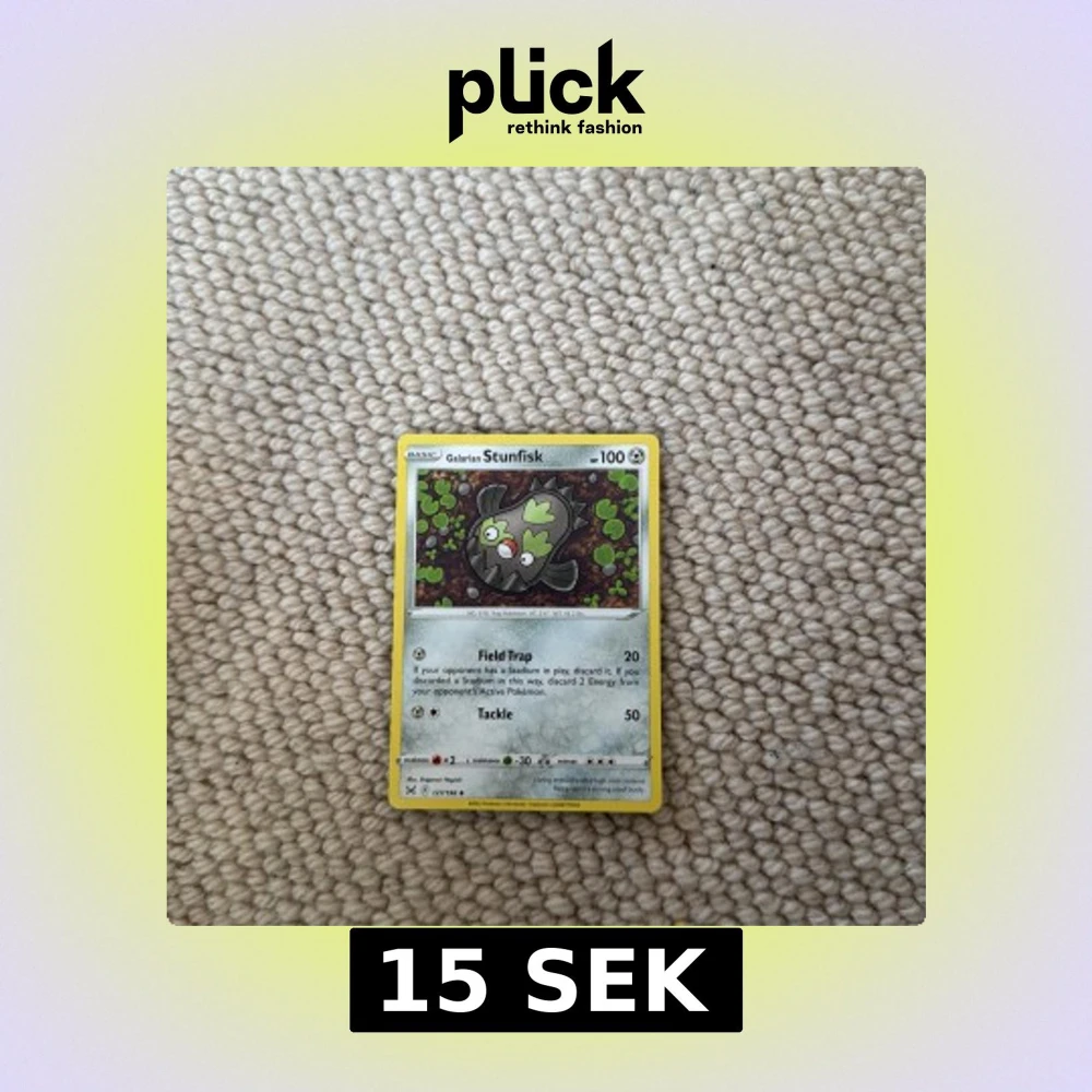 Säljer ett Pokémonkort med Galarian Stunfisk. Kortet har en gul ram och motivet visar Galarian Stunfisk omgiven av gröna detaljer. Kortet har 100 HP och attacker som Field Trap och Tackle. Perfekt för samlare eller Pokémonfans!