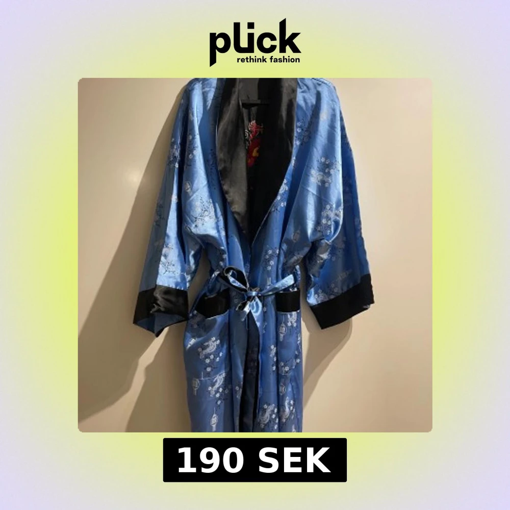 Säljer en fin morgonrock kimonomodell vändbar i blå och svart. Har själv köpt den begagnad därför är jag osäkert på storleken, men skulle gissa M/L. Priset går att diskutera.
