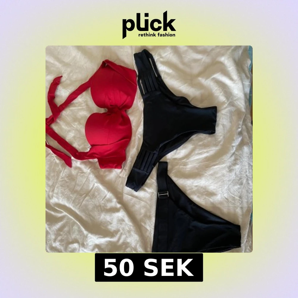 Snygg bikini med röd bandeau-topp som knyts i ryggen och svarta höga bikinitrosor med breda band och spänne på ena sidan. Perfekt för stranden eller poolen, ger en trendig och sportig look.