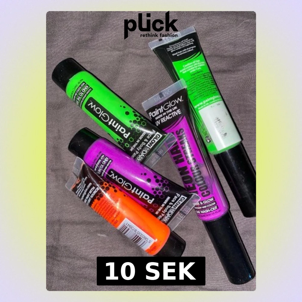 Köpte, öppna men andvända inte. Den ä lite krånglig man måste hälla ut lite i en skål och sen andvända för de e bara en tub. Men hår färgen har som en mascara pensel. Andvända den lila en gång och den funka men blev mer råsa. Funkar bara på blont hår men de tvättas ur bra. Ska lysa i mörker men har inte testat
