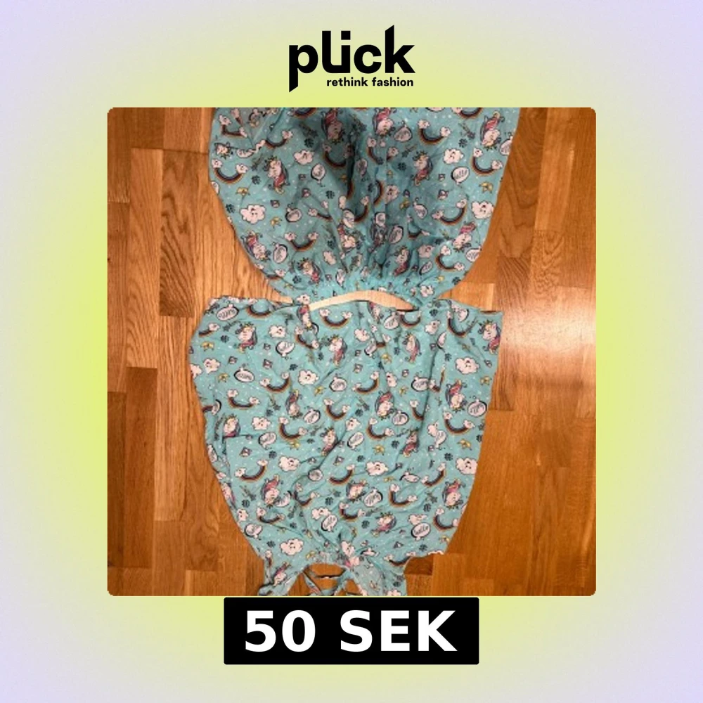 Söt turkos Pyamas set med gulligt enhörningsmönster, regnbågar och moln. Klänningen har snörning i ryggen och är tillverkad i mjuk bomull. Perfekt för dig som gillar färgglada och lekfulla prints.