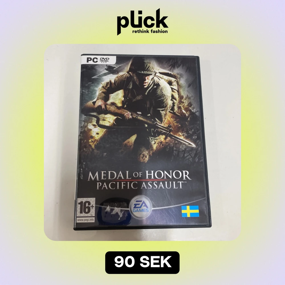 Säljer ett PC-spel, Medal of Honor: Pacific Assault, från EA Games. Spelet är i en svart DVD-fodral med en dramatisk omslagsbild av en soldat i strid. Det är märkt för 16+ och har en svensk flagga på framsidan. Perfekt för dig som gillar actionfyllda krigsspel och vill uppleva intensiva strider i Stilla havet.