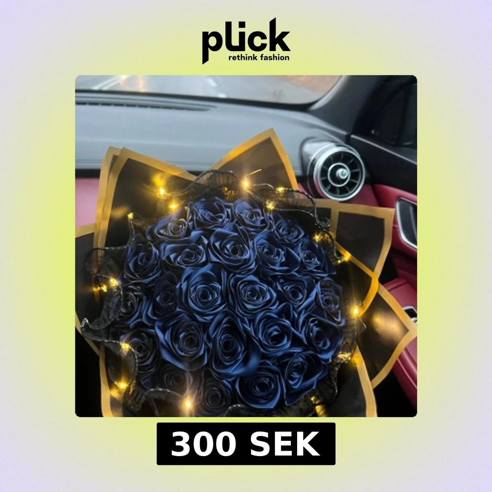 En elegant bukett med mörkblå rosor, dekorerad med en varm ljusslinga som ger ett stämningsfullt sken. Perfekt som en unik present eller dekoration.