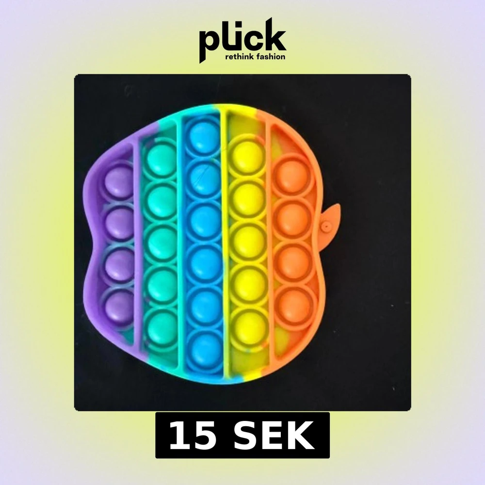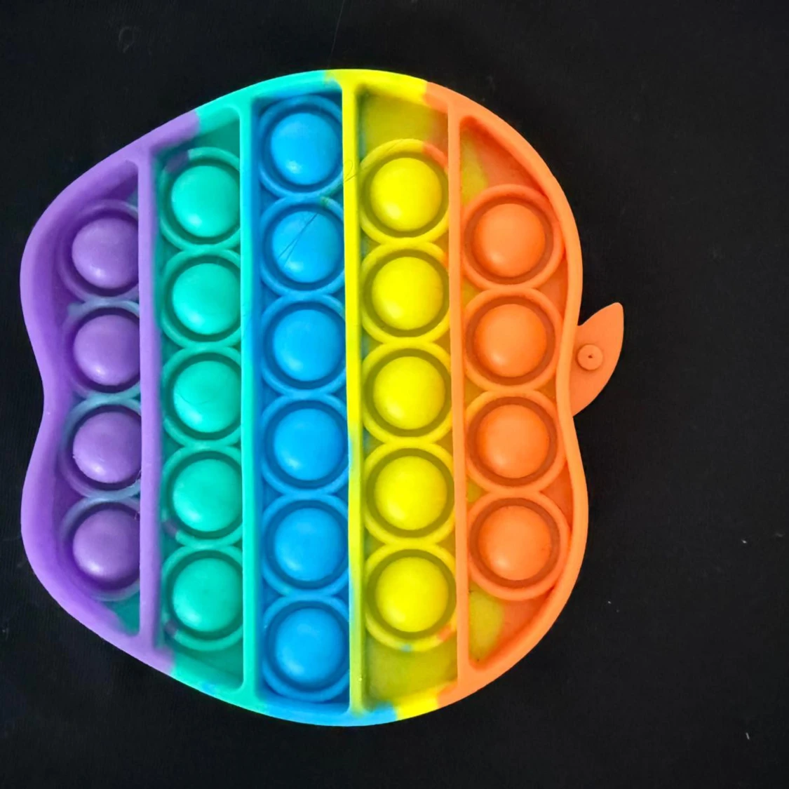 Säljer en pop it i form av ett äpple med regnbågsfärger. Gjord i mjukt silikon och perfekt för stresslindring eller som leksak. Färgerna går i lila, blå, grön, gul och orange. Enkel att ta med överallt.