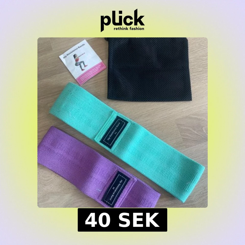 Två breda träningsbälten i mintgrönt och lila, perfekta för styrketräning och aktivering av höft och ben. Banden är tillverkade i slitstarkt tygmaterial och kommer med en svart förvaringspåse.