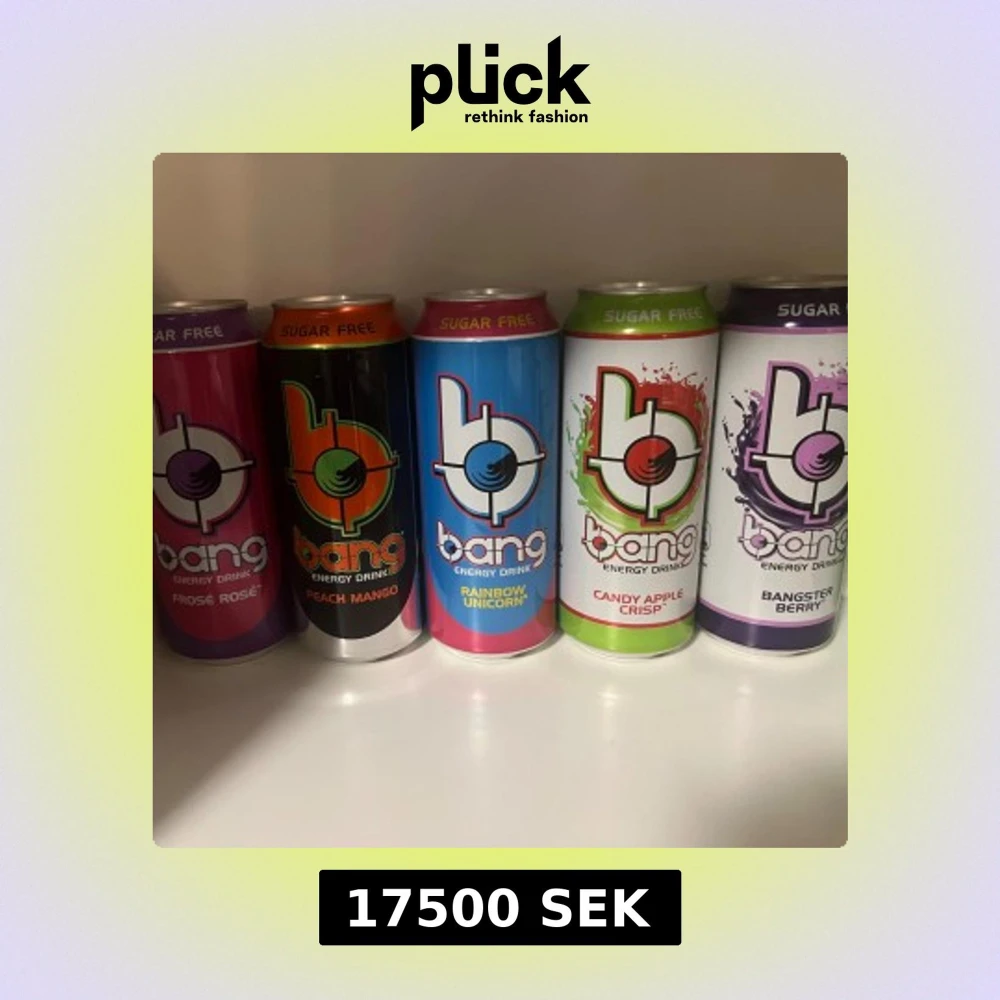 Bilden visar fem burkar Bang Energy Drink i olika smaker. Detta är inte en elektronikprodukt.