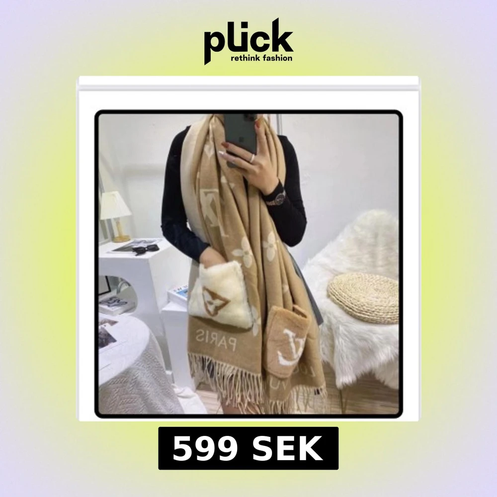 Lyxig beige halsduk från Vuitton med stora logotyper och blommönster i vitt. Utrustad med två mjuka fuskpälsfickor, en i vitt och en i ljusbrunt, båda med broderade -detaljer. Halsduken har fransar i ändarna och är perfekt för att hålla värmen med stil.
