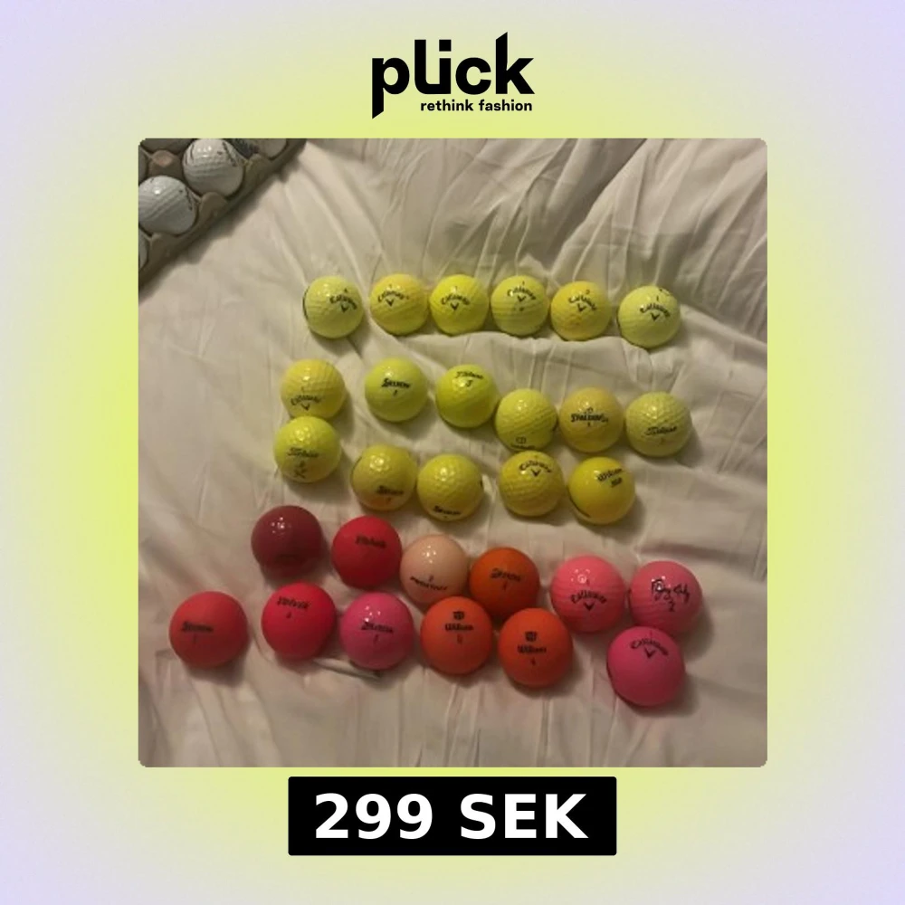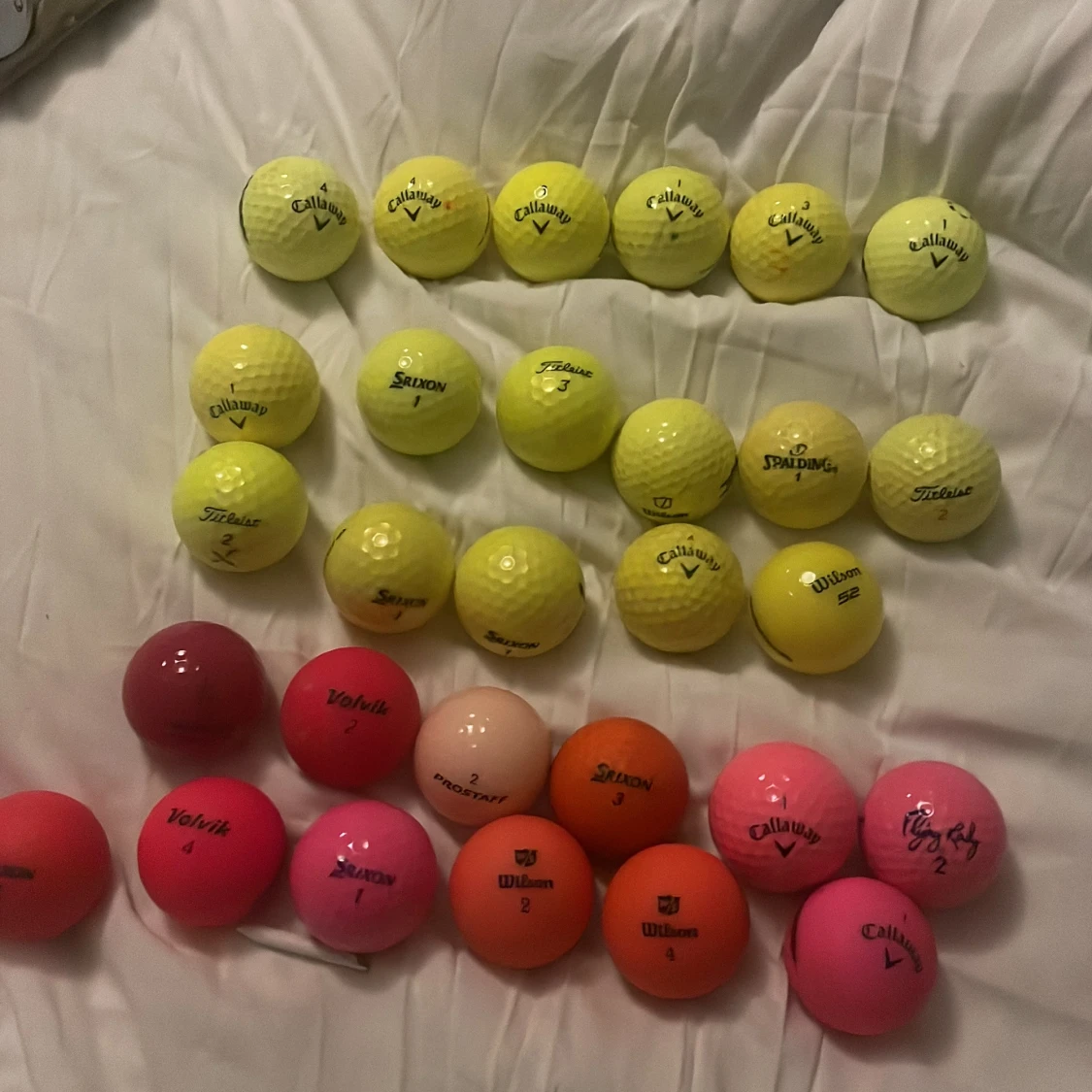 Samling med 29 färgglada golfbollar från kända märken som Callaway, Wilson, Srixon, Titleist, Spalding och Volvik. Bollarna är i blandat skick, vissa med mindre slitage. Perfekt för dig som vill synas på banan eller behöver extra träningsbollar.