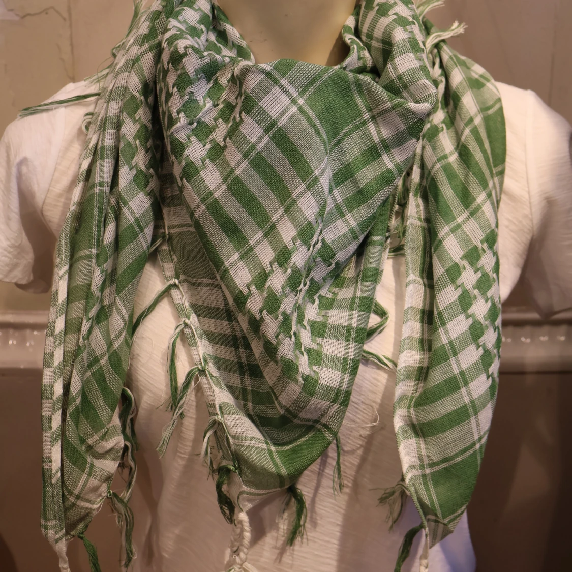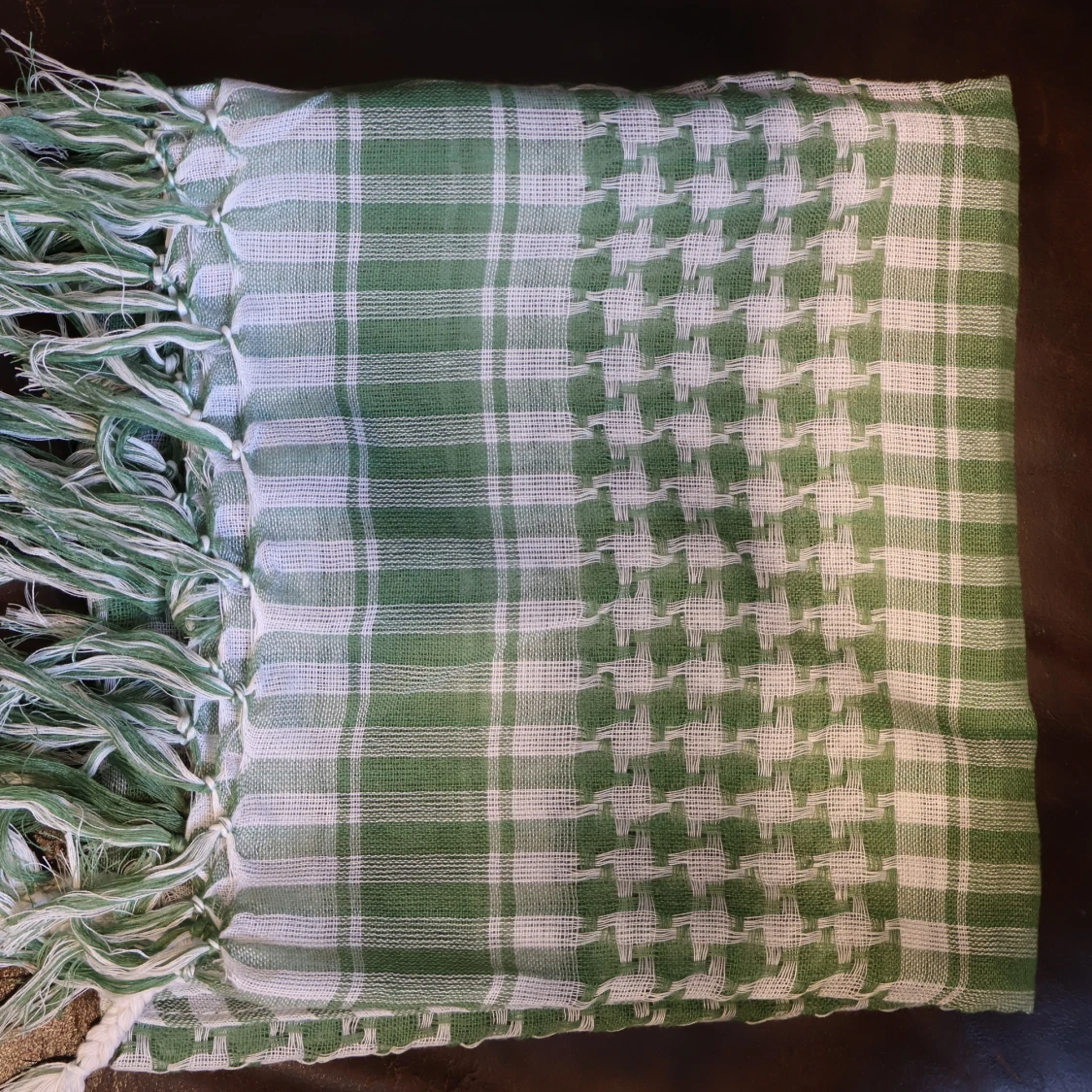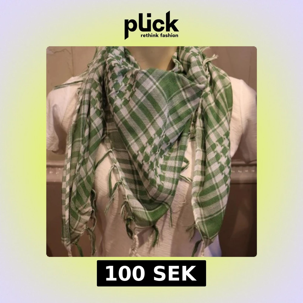 Säljer en grön och vit rutig halsduk med fransar i kanterna. Halsduken har ett klassiskt mönster och är lätt och luftig, perfekt att slänga över axlarna för extra stilpoäng.
