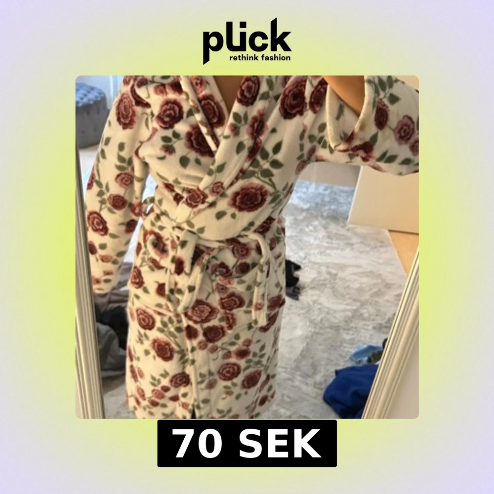 Supermjuk vit morgonrock i fleece med stora blommor i vinrött och gröna blad. Omlottmodell med knytband i midjan och långa ärmar. Perfekt för att chilla hemma och hålla sig varm. Passar en s/m i storleken.