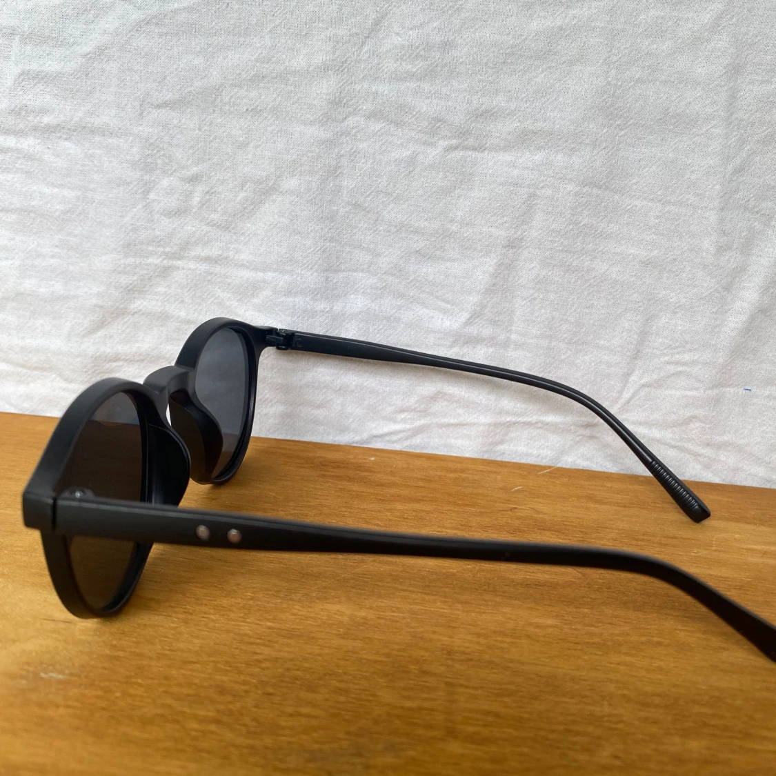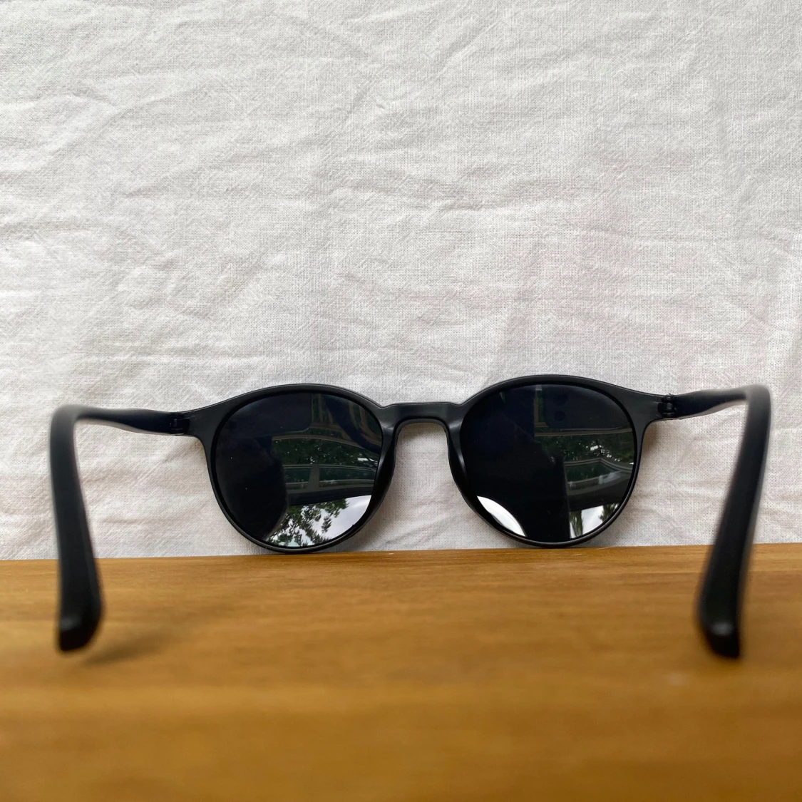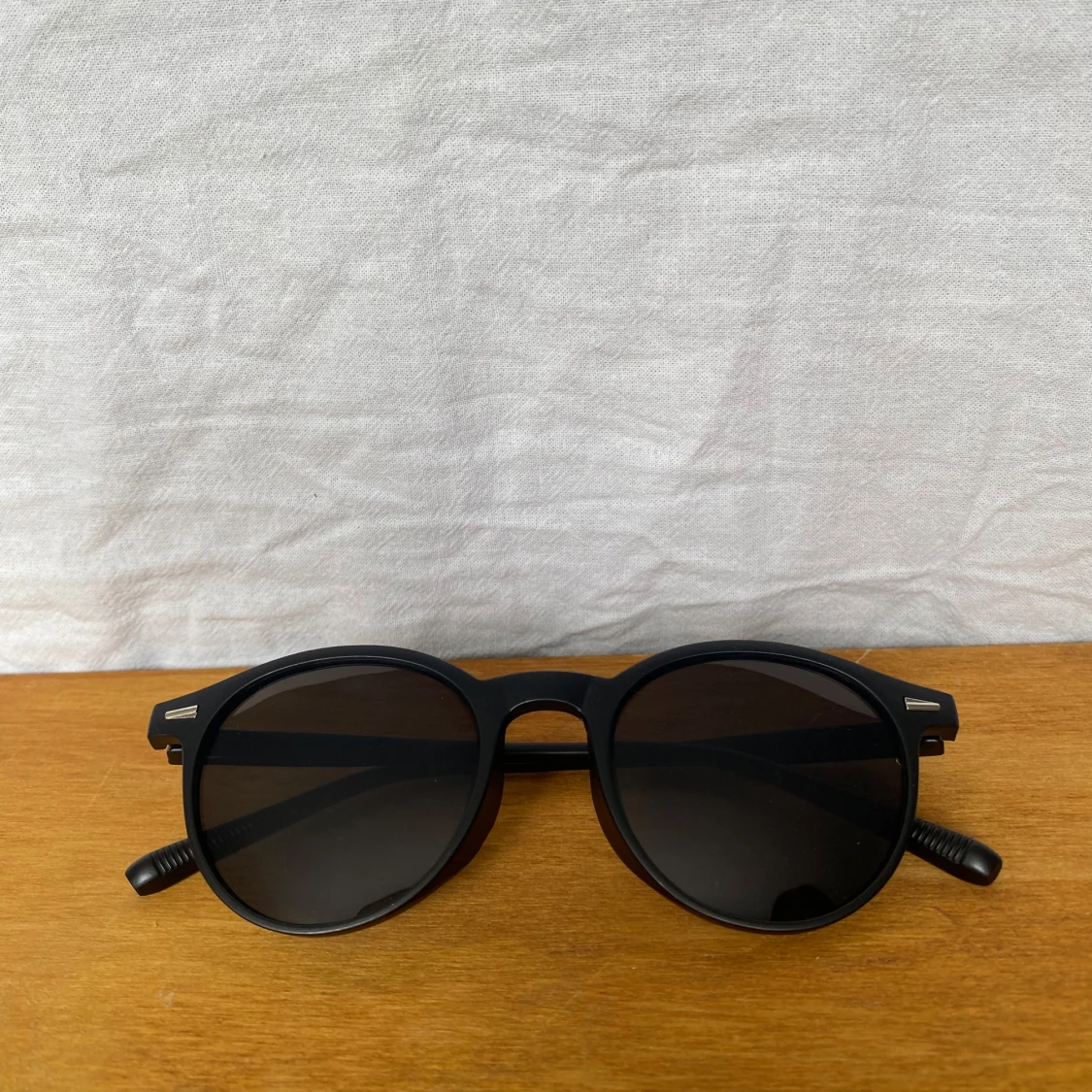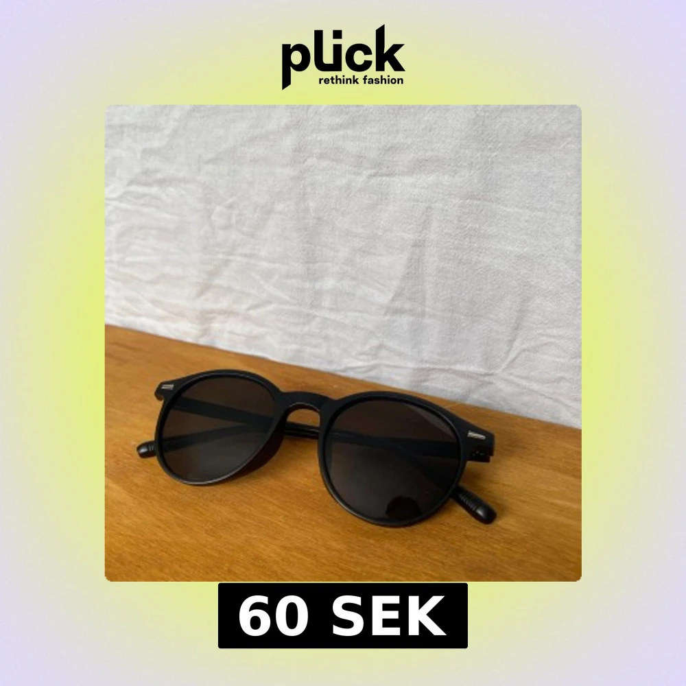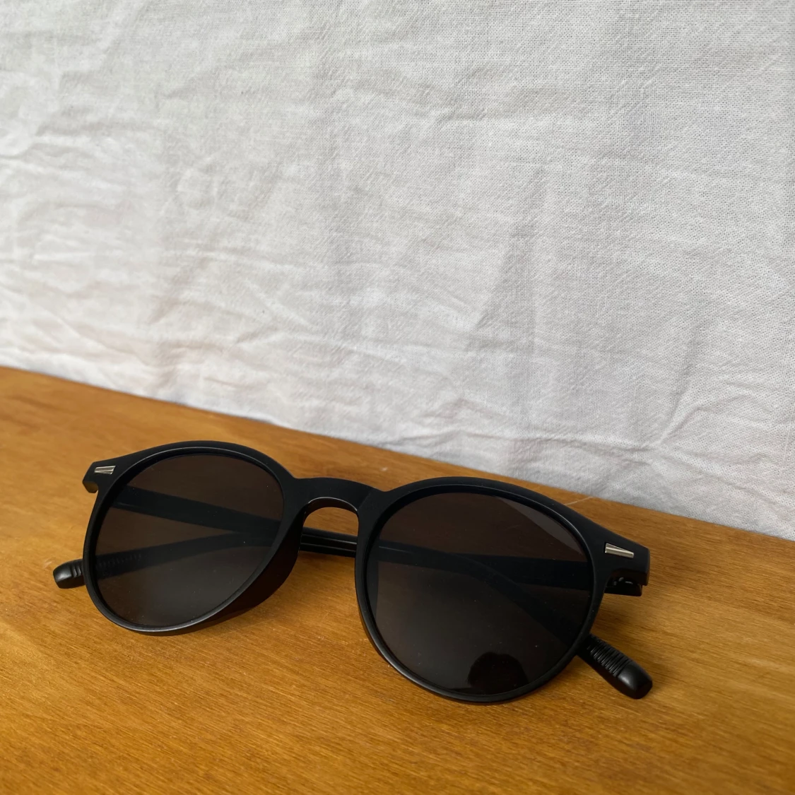 Nya stilrena svarta solglasögon med rundade bågar och mattsvart finish. Klassisk modell med mörka glas. 60kr (säljs utan fodral och prislapp)