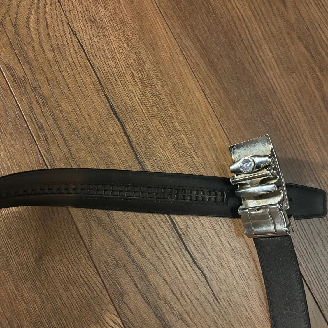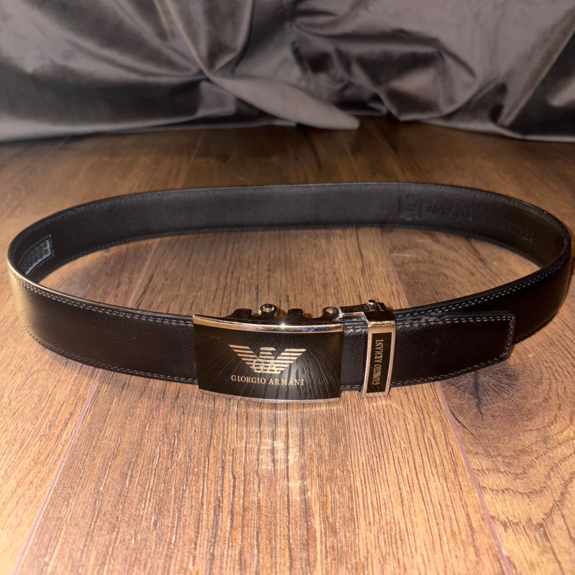 Snyggt svart bälte från Giorgio Armani med exklusivt spänne i silverfärg och märkets logga framtill. Bältet är gjort i skinn och har en stilren, klassisk design som passar till jeans eller kostymbyxor. Perfekt accessoar för att lyfta din outfit.