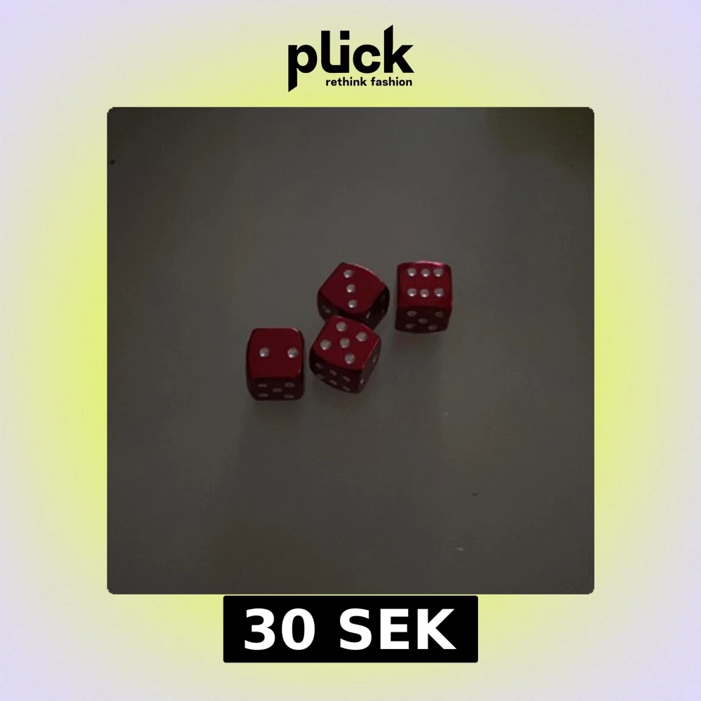 Bilderna visar fyra röda tärningar med vita prickar. En av tärningarna har ett hål i mitten, vilket tyder på defekt eller modifiering. Tärningarna ser ut att vara i metall och har en blank finish. Viss ytslitage kan ses, men överlag är de i gott skick för spel eller samling. Man sätter dom där luften kommer in på hjulet
