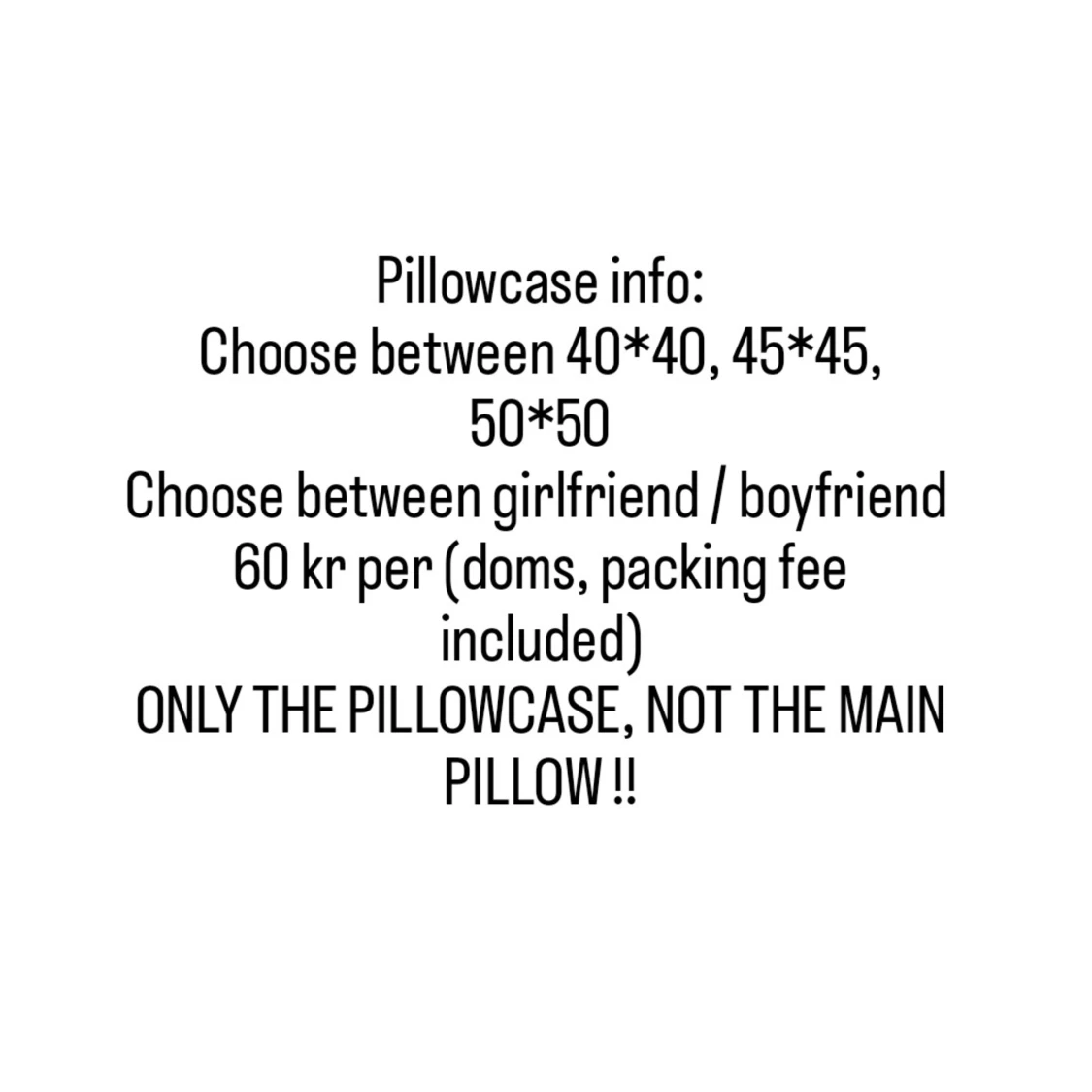 I love my boyfriend/ girlfriend go !! Need minimum of 5 people to join !! Keychain info: 3x5cm Choose between girlfriend/ boyfriend 40kr per (doms, packing fee included) Pillowcase info: Choose between 40*40, 45*45, 50*50 Choose between girlfriend/ boyfriend 60 kr per (doms, packing fee included) ONLY THE PILLOWCASE, NOT THE MAIN PILLOW !! 1- 4 Payments: Intals Doms Packing fee Ems No backout unless replacement !! Not responsible for lost or damaged package !!