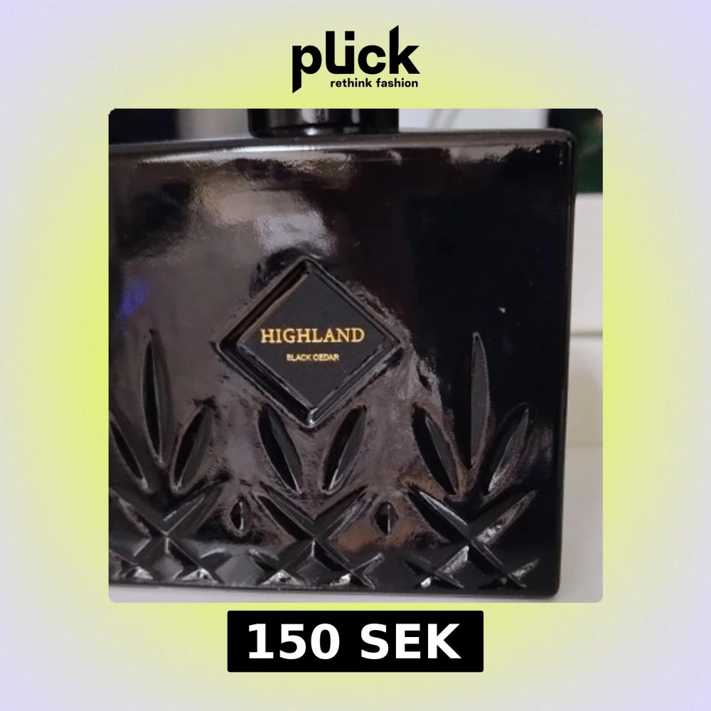 Elegant diffuser från Highland med doften Black Cedar. Flaskan är svart med ett stilrent mönster och guldtext. Perfekt för att skapa en lyxig atmosfär i hemmet.