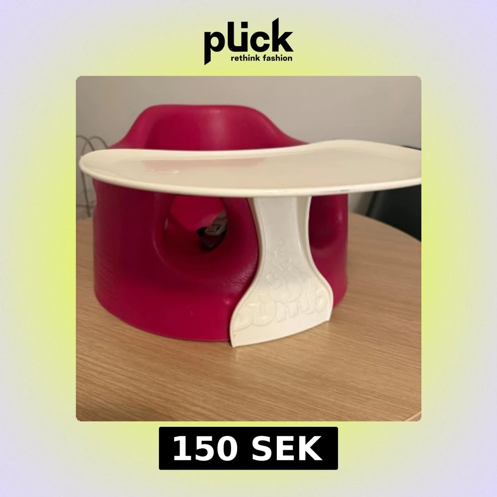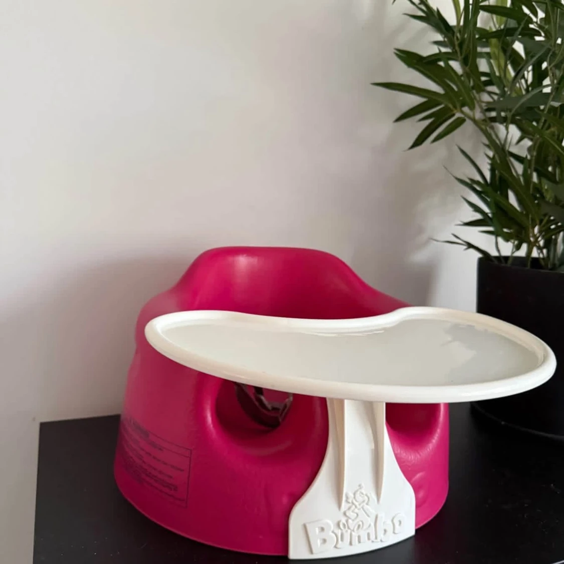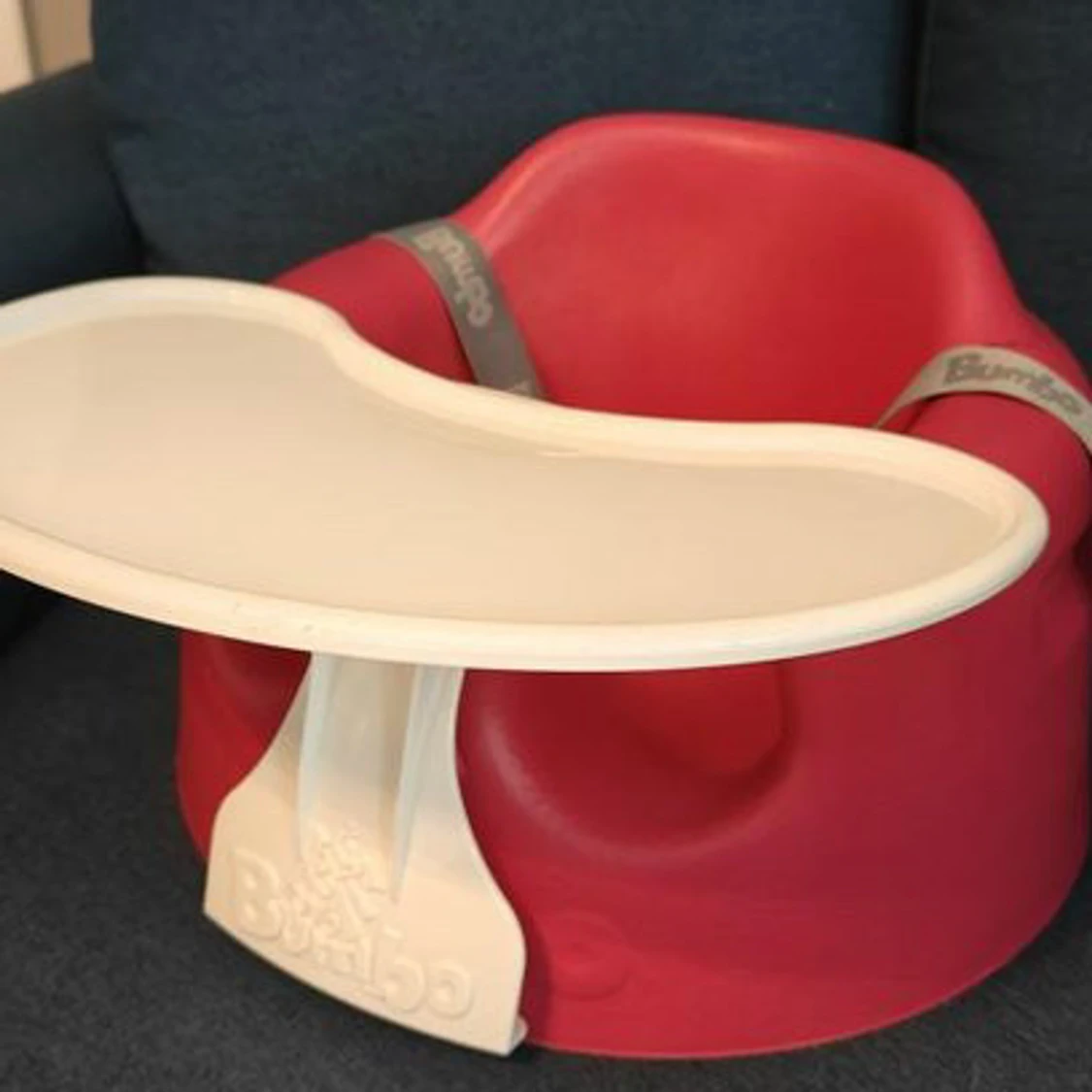 Praktisk Bumbo babysitter i röd färg med avtagbar vit bricka. Perfekt för små barn som lär sig sitta. Brickan är lätt att rengöra och stolen har säkerhetsbälte. Några mindre märken finns, men överlag i gott skick.