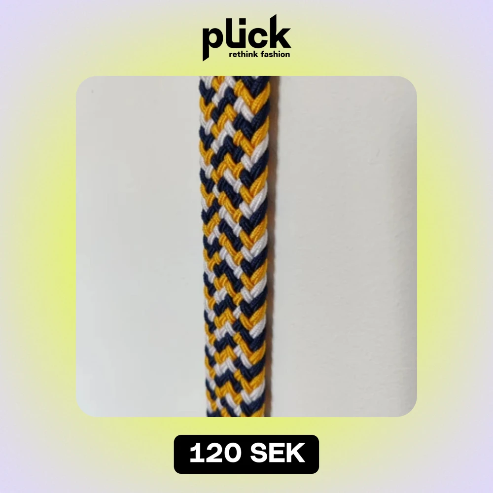 Säljer ett snyggt flätat bälte med ett coolt mönster i blått, vitt och gult. Bältet har en brun skinnliknande detalj vid spännet som ger en stilren touch. Perfekt för att liva upp vilken outfit som helst!