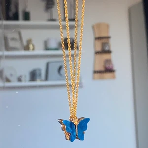 Ett guld halsband med en blå fjäril på!🦋 bild 2 är där man sätter ihop halsbandet!📦💕