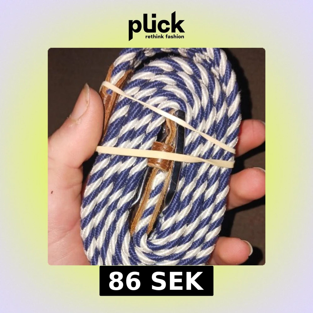 Säljer ett snyggt randigt bälte i blått och vitt med bruna läderdetaljer. Bältet har en stilren design med ett silverfärgat spänne. Perfekt för att ge din outfit en extra touch.