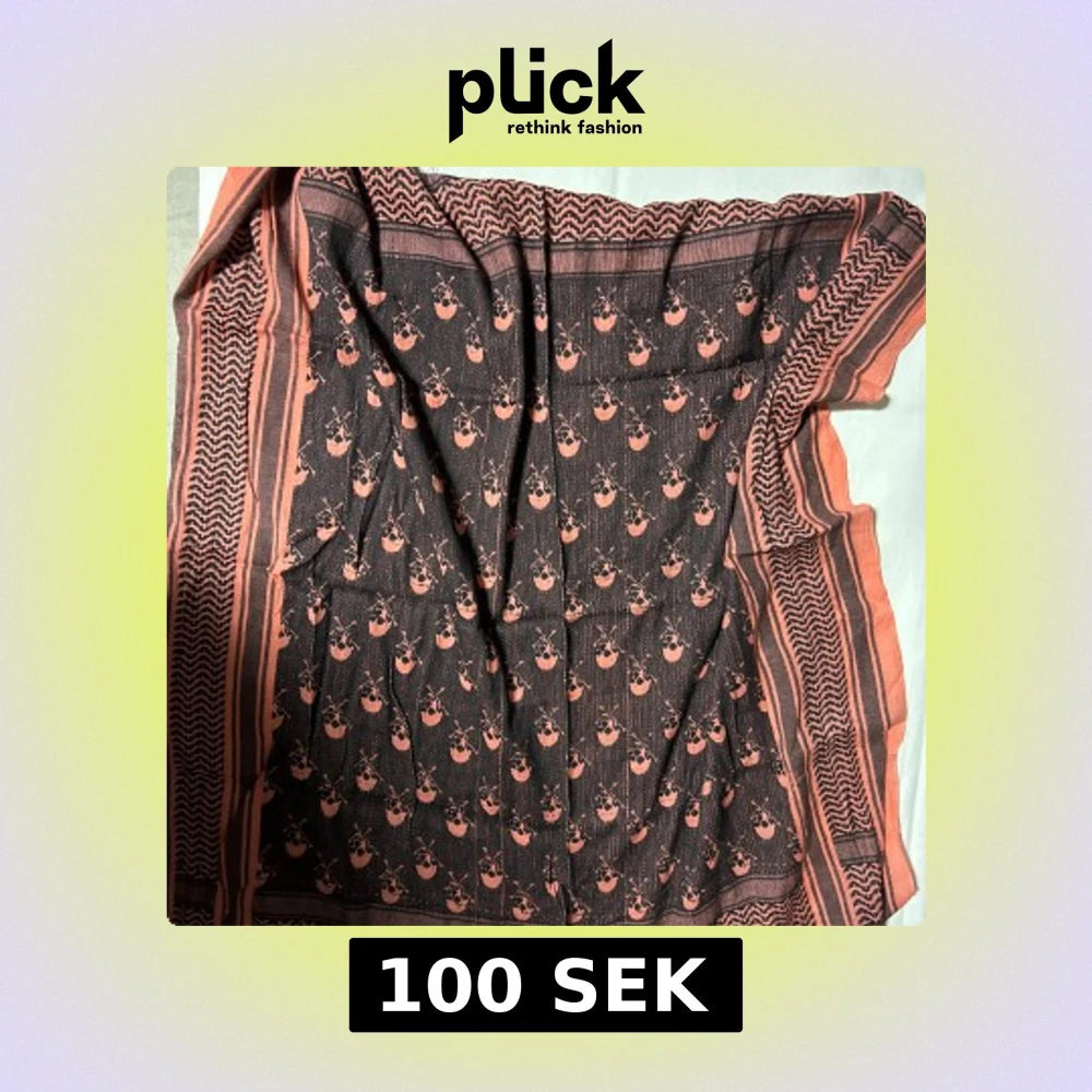 Säljer en svart halsduk med rosa blommigt mönster och dekorativa ränder längs kanterna. Halsduken är tunn och mjuk, perfekt som accessoar för att liva upp din outfit. Helt ny.