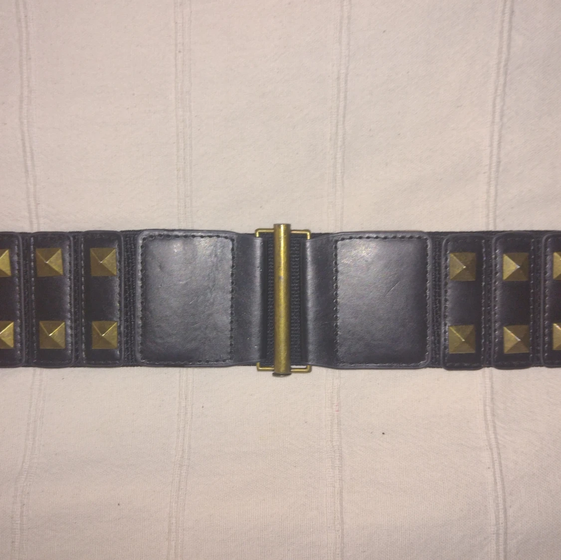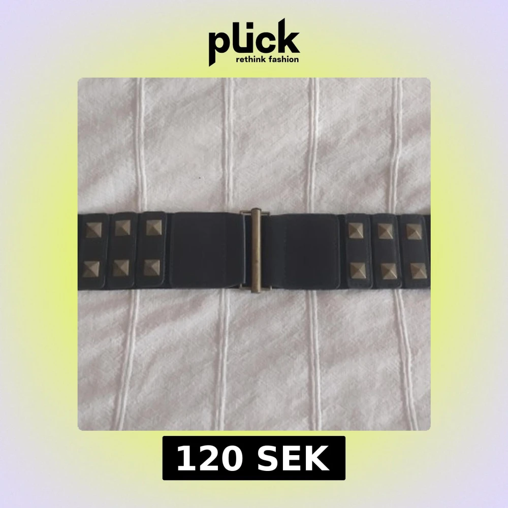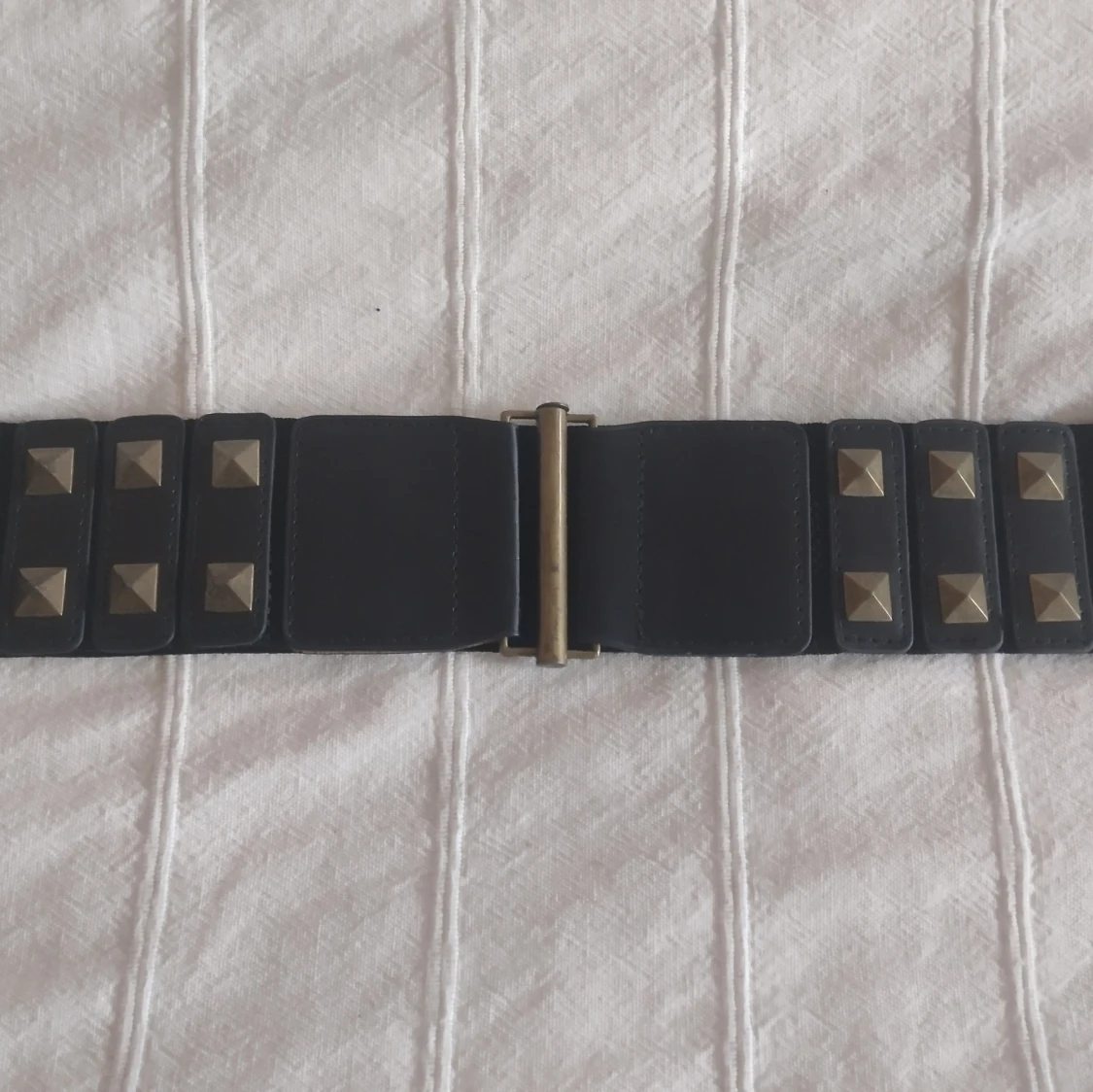 Brett svart midjebälte med coola fyrkantiga guldfärgade nitar och metallspänne. Bältet har en mix av elastiskt tyg och skinnimitation framtill, vilket ger både stil och komfort. Perfekt för att ge din outfit en edgy touch.