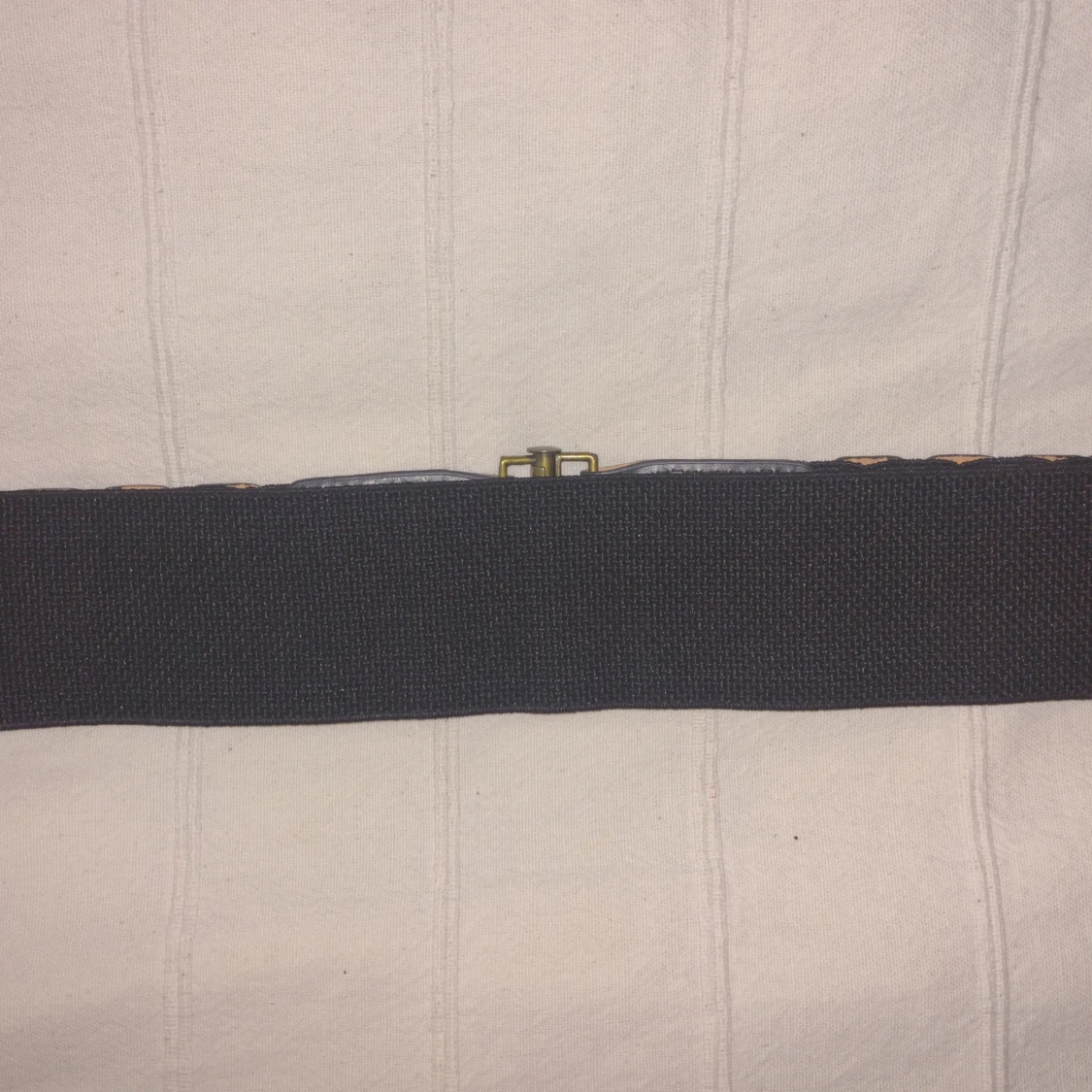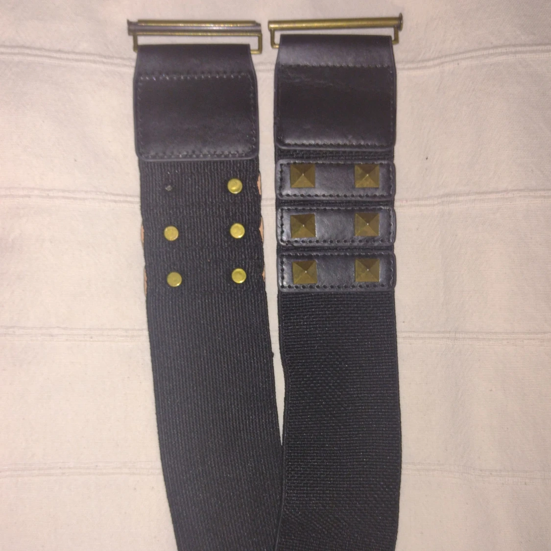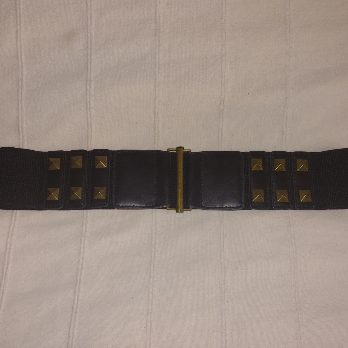 Brett svart midjebälte med coola fyrkantiga guldfärgade nitar och metallspänne. Bältet har en mix av elastiskt tyg och skinnimitation framtill, vilket ger både stil och komfort. Perfekt för att ge din outfit en edgy touch.