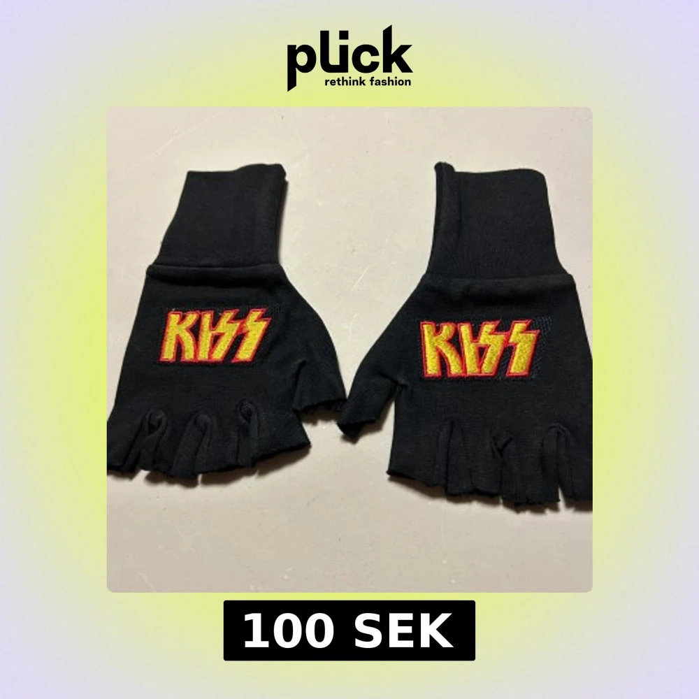 Svarta fingerlösa handskar med broderad KISS-logga i gult och rött på ovansidan. Perfekta för dig som vill sticka ut och visa din kärlek till bandet. Tunt och stretchigt material som sitter skönt på handen. Helt nya. Stretchig bomullstrikå.