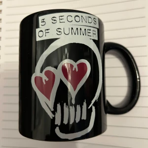 Snygg svart mugg med ett coolt tryck av en dödskalle med hjärtformade ögon och texten '5 Seconds of Summer'. Perfekt för fans av bandet som vill ha en unik kaffemugg. Muggen kommer i en dekorativ förpackning. Helt ny.