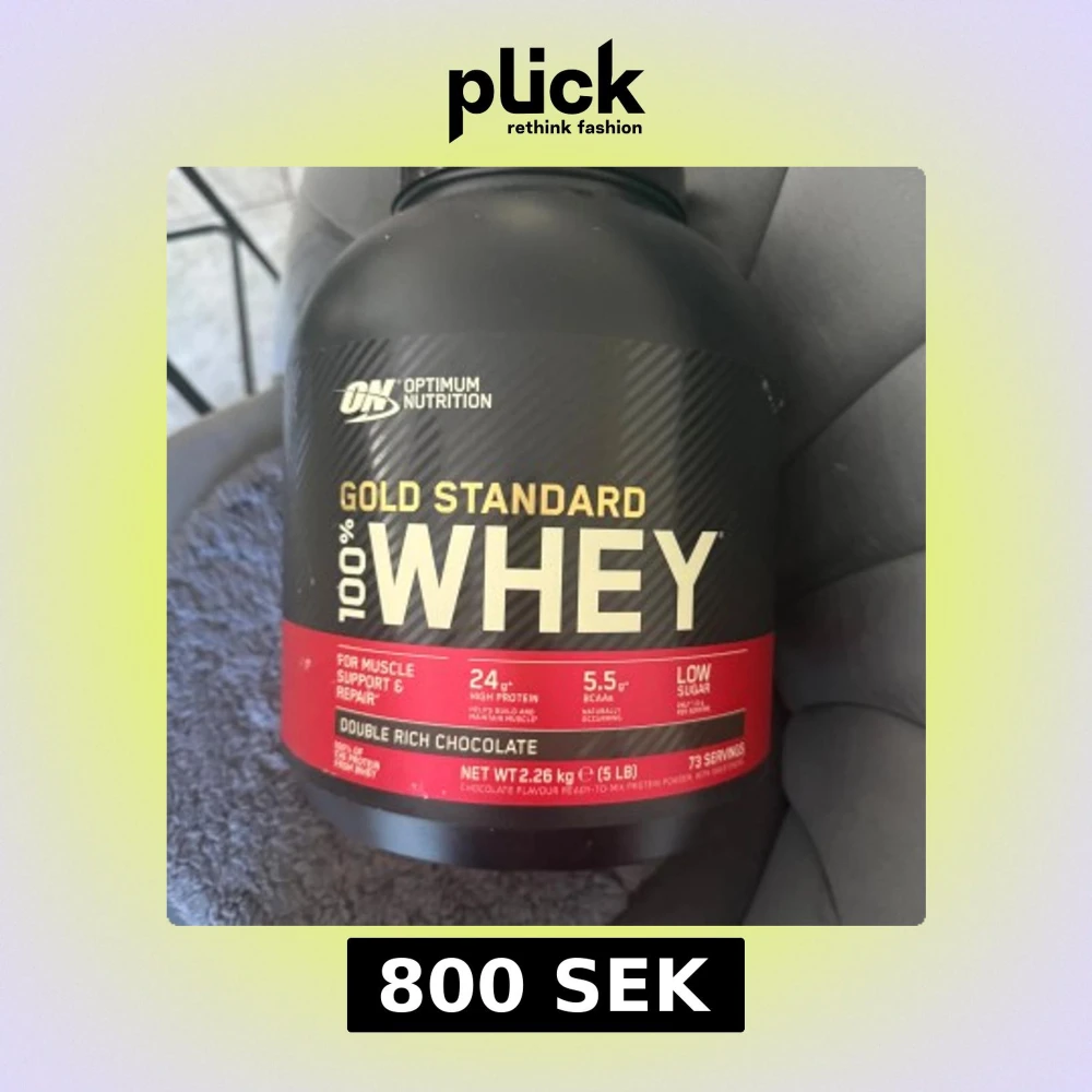 Säljer en stor burk med Optimum Nutrition Gold Standard 100% Whey i smaken Double Rich Chocolate. Innehåller 2,26 kg (5 lb) och ger 73 portioner. Perfekt för muskelstöd och återhämtning med 24 g protein per portion och låg sockerhalt.