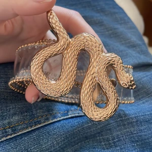 Skitsnyggt skärp! Säljer endast pga att det är i guld. Det är i perfekt skick och har en orm som spänne. Själva skärpet är i plast med guld på kanterna. Lite drygt 100cm långt.