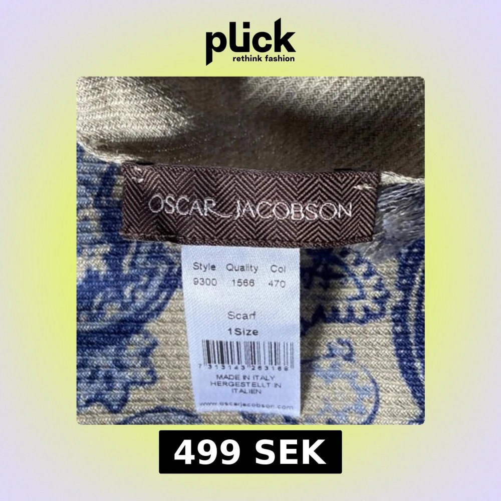 Snygg beige halsduk från Oscar Jacobson med blått paisleymönster. Tillverkad i Italien, mjukt material och elegant design. Perfekt att slänga över axlarna för en cool och stilren look. One size.