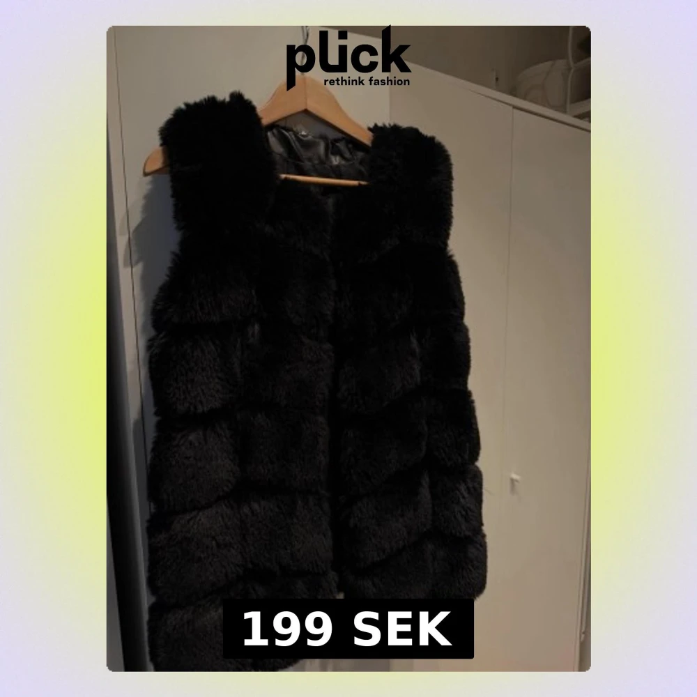 Säljer en svart pälsväst från garoff med breda, horisontella paneler och mjuk, fluffig känsla. Västen är ärmlös och har en stilren look utan synliga knappar eller dragkedja. Perfekt för att lyfta vilken outfit som helst under kyligare dagar. Har även fickor. Storlek 36. Pris kan diskuteras!
