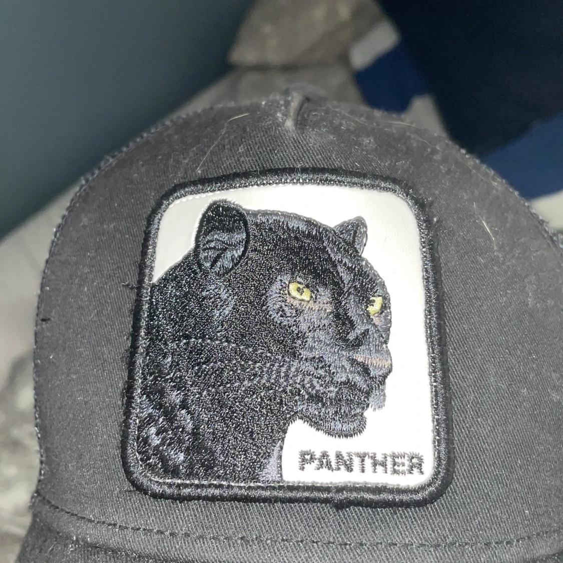 En svart goorin bros keps med panther designen på framsidan. Nästan oanvänd.