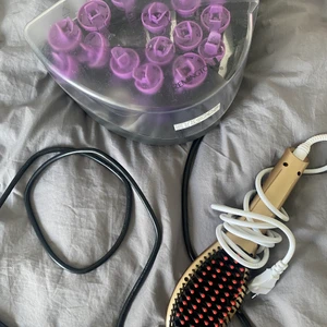En värmeborste och papiljotter man värmer för att få volym i håret. 200kr st eller 350 för båda!
